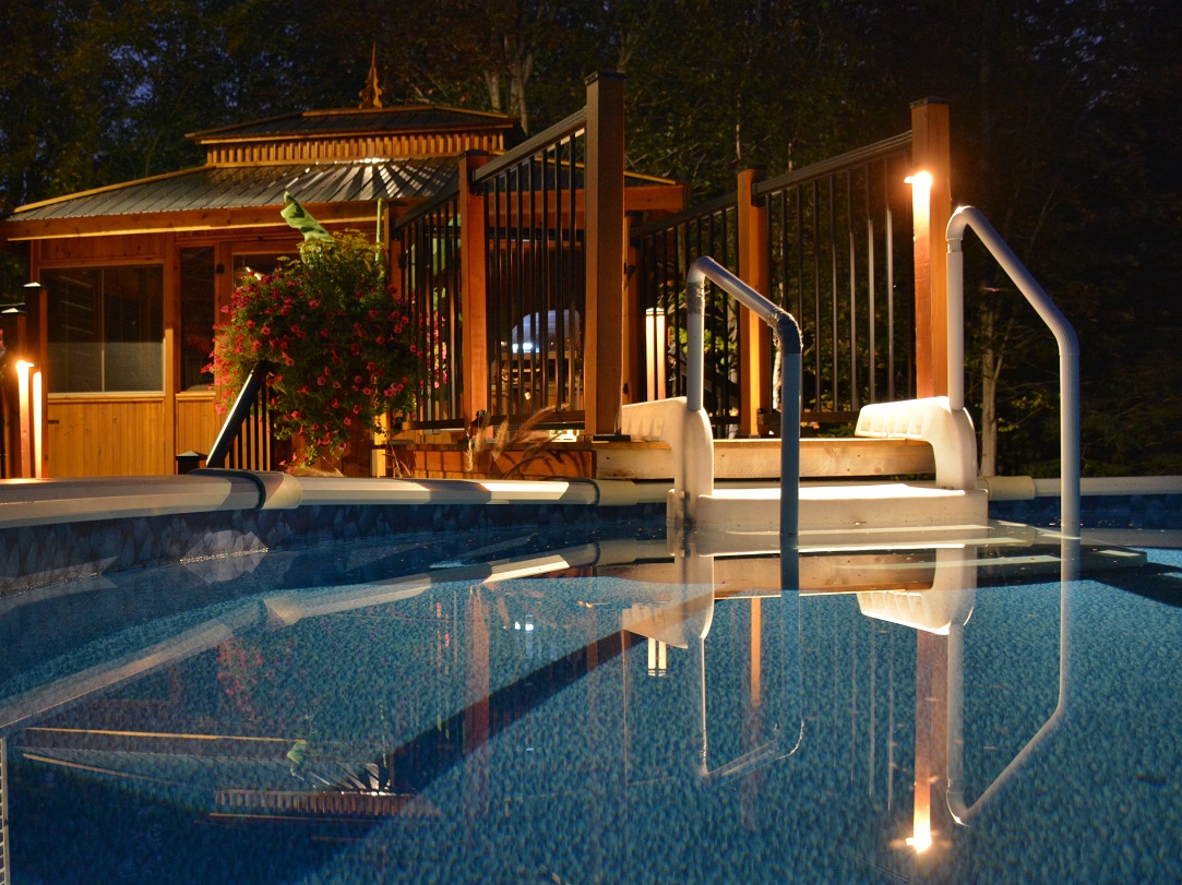 Favorisant le cocooning, la richesse du cèdre rouge de l’ouest donne toute la splendeur à cette arrière-cour. Combiné à l’aluminium noir qui donne un contraste très intéressant, ce patio est vraiment fait pour durer plusieurs années. En plus de l’accès à la piscine, la passerelle permet de mettre les accessoires à l’abri des regards. Quelques luminaires placés de façon judicieuse rehaussent le cachet unique de l’endroit même à la tombée du jour.